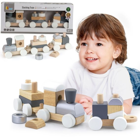 Kolorowa Kolejka z wagonikami do ciągania od firmy Viga to jedna z czołowych zabawek, która sprawdzi się jako pomoc u dzieci, które zaczynają stawiać pierwsze kroki. Kolejka z wagonikami będzie dla nich atrakcją i zachętą do doskonalenia umiejętności chodzenia. Kolorowe wagoniki cieszą oko i zachęcają do zabawy. Kolorowe klocuszki można łączyć ze sobą poprzez nakładanie elementów na drewniany kołeczek.
