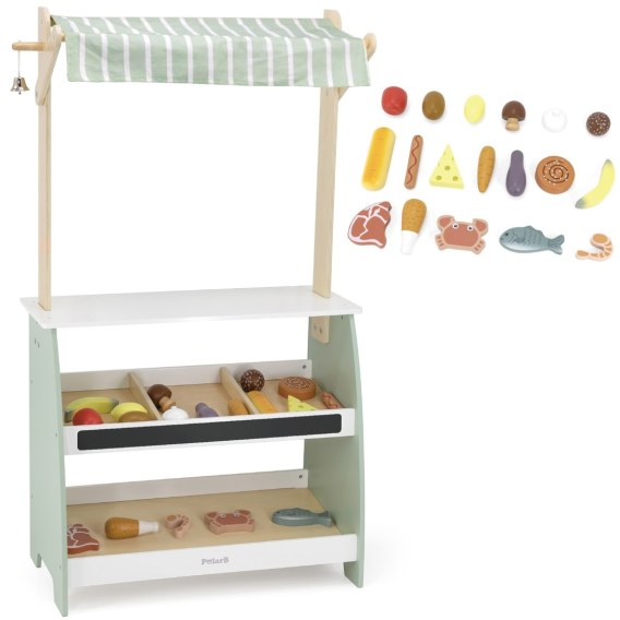 Drewniane Stoisko Targowe od marki VIGA pozwoli na wejście na wyższy poziom zabawy w odgrywanie roli sprzedawcy. Wykonanyz solidnego drewna stragan pomalowany w pastelowe odcienie zieleni z pewnością zauroczy podopiecznych i stanie się ulubionym kącikiem zabaw. Znajdziemy w nim dwie półki, z czego wyższą podzieloną na trzy oddzielne przegródki, materiałowy daszek, małą tablicę kredową do opisania sprzedawanych przedmiotów i wpisania cen, a także malutki dzwoneczek do zwracania uwagi klientów. W zestawie z 18 artykułami spożywczymi, które nie pozwolą by ten stragan pozostał pusty.