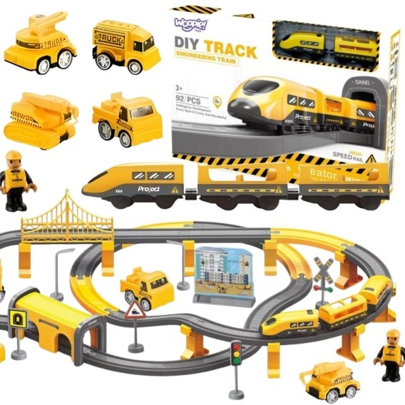 Fascynujący zestaw kolejki elektrycznej marki Woopie to prawdziwe centrum dowodzenia dla małych konstruktorów! Żółty pociąg ekspresowy z realistycznymi efektami dźwiękowymi wprowadzi dziecko w świat budowy, planowania tras i tworzenia własnych scenariuszy zabawowych. Dzięki bogatemu wyposażeniu w mosty, tunele, sygnalizację świetlną i pojazdy budowlane, maluch może komponować nieograniczoną liczbę układów torowych, a następnie obserwować, jak pociąg mknie przez ich autorskie miasto. To zabawka, która łączy ekscytację prawdziwej kolei z kreatywnością dziecięcego świata (Efekty dźwiękowe wydaje jeden z elementów torów kiedy przejedzie przez po nim pociąg)