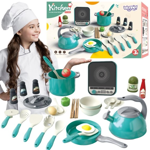 Ten obszerny zestaw do zabawy w kuchnię od marki Woopie to idealny prezent dla każdego małego kucharza! Zabawka pozwala dzieciom na naśladowanie dorosłych i odgrywanie ról, rozwijając ich kreatywność, wyobraźnię oraz zdolności manualne. Zestaw zawiera wszystko, czego potrzeba do przygotowania wymarzonego posiłku.W skład zestawu wchodzi aż 30 elementów, w tym garnki, patelnia z jajkiem sadzonym, czajnik, a nawet indukcyjna płyta grzewcza z efektami świetlnymi. Dodatkowe akcesoria, takie jak sztućce, warzywa, i przyprawy sprawiają, że zabawa staje się niezwykle realistyczna i wciągająca. To doskonały sposób na naukę przez zabawę, rozwijanie zdolności społecznych i spędzanie czasu z rodzicami.