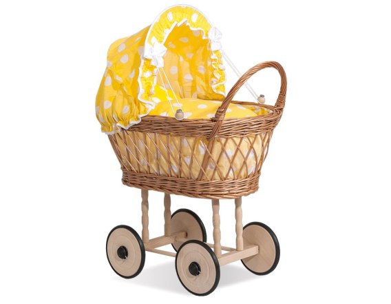 Wiklinowy wózek dla lalek wysoki ażurowy z żółtą pościelką i wyściółką VERONICA - naturalny