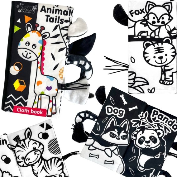 Książeczka kontrastowa od marki Woopie stworzona specjalnie dla maluchów. Szeleszczące ibardzo miękkie w dotyku strony rozwijają zmysły maluszka pełniąc funkcję sensoryczną. Czarno-białe ilustracje trenują wzrok i spostrzegawczość. W każdej ze stron wystają ogonki różnych zwierzątek, łapiąc za nię maluszek ćwiczy koordynację wzrokowo-ruchową. Książeczka może służyć jako zawieszka do wózka lub łóżeczka, mocowana na rzep.