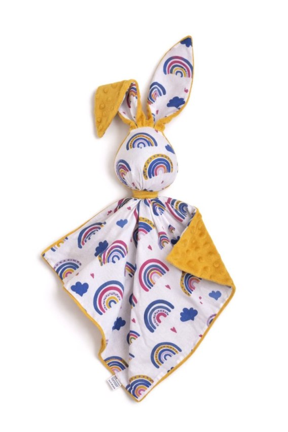 Zając przytulanka DOUDOU dwustronna bawełna i minky - Tęcza - musztardowy